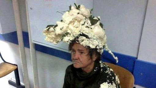 Woman applies PU-foam on her hair by mistake.